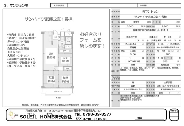 980万円 サンハイツ武庫之荘1号棟