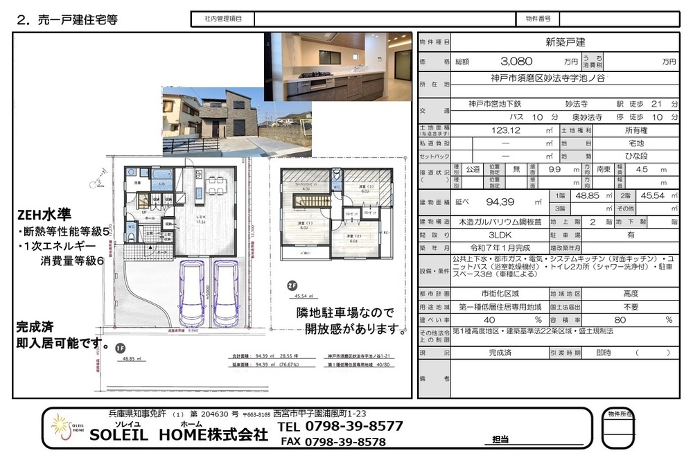 省エネルギー対策 / 駐車3台以上可 / 即引渡可 / システムキッチン / 浴室乾燥機 / 陽当り良好 / 全居室収納 / 閑静な住宅地 / LDK15畳以上 / シャワー付洗面化粧台 / 対面式キッチン / ハイルーフ駐車場 / トイレ2ヶ所 / 浴室1坪以上 / 2階建 / 2面以上バルコニー / 東南向き / 南面バルコニー / 温水洗浄便座 / 浴室に窓 / TVモニタ付インターホン / 通風良好 / ウォークインクローゼット / 全居室6畳以上 / 都市ガス / 小学校 徒歩10分以内 / 食器洗乾燥機
