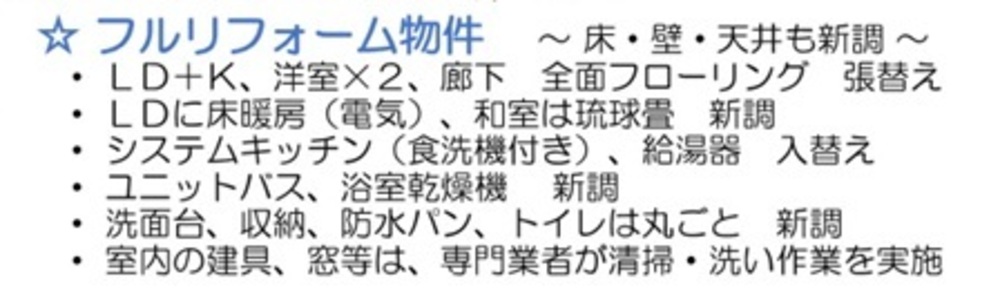 床・壁・天井LDK、洋室、廊下全面フローリング LDに床暖房、和室は琉球畳システムキッチン(食洗機付き)、給湯器トイレ、ユニットバス(浴室乾燥機付)、洗面台、防水パン