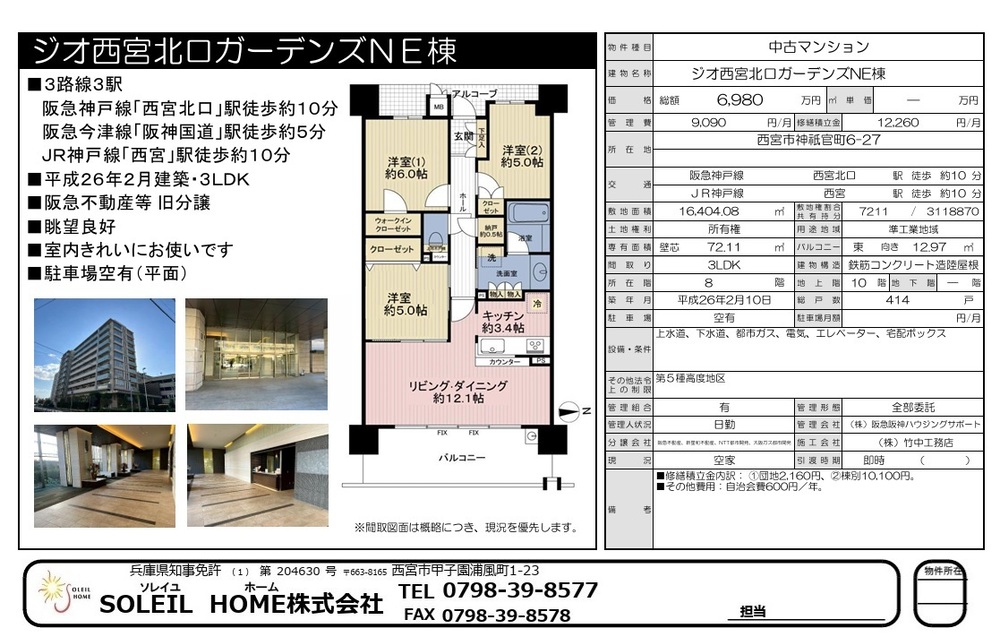 6980万円 ジオ西宮北口ガーデンズNE棟