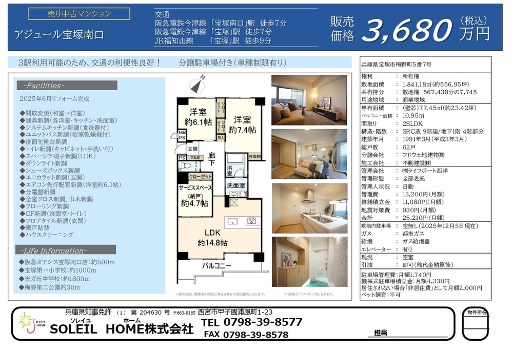 2沿線以上利用可 / スーパー 徒歩10分以内 / 市街地が近い / 内装リフォーム / システムキッチン / 浴室乾燥機 / 陽当り良好 / 全居室収納 / 閑静な住宅地 / シャワー付洗面化粧台 / 対面式キッチン / 自走式駐車場 / 浴室1坪以上 / 東南向き / 南面バルコニー / フローリング張替 / 平面駐車場 / 温水洗浄便座 / 浴室に窓 / TVモニタ付インターホン / 通風良好 / エレベーター / 駐輪場 / 納戸 / 食器洗乾燥機 / バイク置場