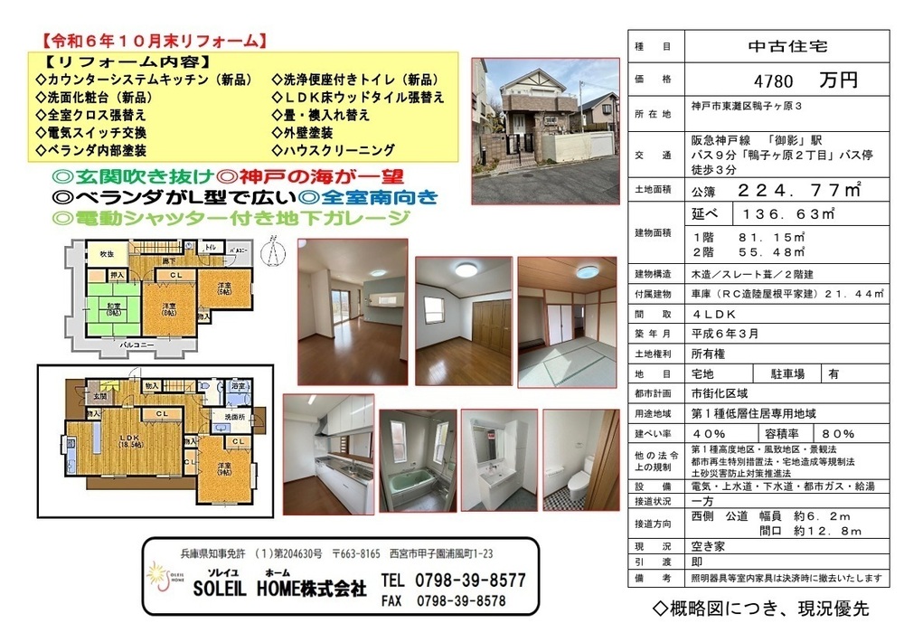 土地50坪以上 / LDK18畳以上 / スーパー 徒歩10分以内 / 内外装リフォーム / 内装リフォーム / 南向き / システムキッチン / 陽当り良好 / 全居室収納 / 閑静な住宅地 / 総合病院 徒歩10分以内 / 和室 / シャワー付洗面化粧台 / トイレ2ヶ所 / 外装リフォーム / 2階建 / 2面以上バルコニー / 南面バルコニー / フローリング張替 / 全室南向き / 温水洗浄便座 / 浴室に窓 / 吹抜け / TVモニタ付インターホン / 通風良好 / 眺望良好 / シャッター車庫 / 全居室6畳以上 / IHクッキングヒーター / 都市ガス / 食器洗乾燥機