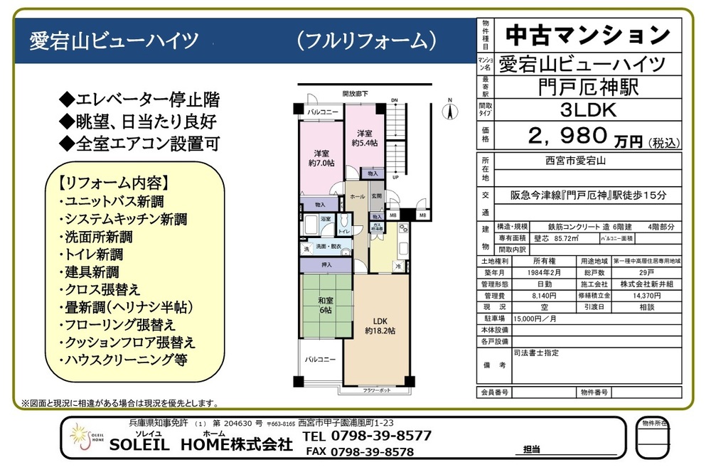 2沿線以上利用可 / LDK18畳以上 / スーパー 徒歩10分以内 / 内装リフォーム / 南向き / システムキッチン / 陽当り良好 / 全居室収納 / 和室 / 2面以上バルコニー / 南面バルコニー / フローリング張替 / リノベーション / 通風良好 / 眺望良好 / シューズインクローク / 小学校 徒歩10分以内 / エレベーター / 駐輪場 / バイク置場