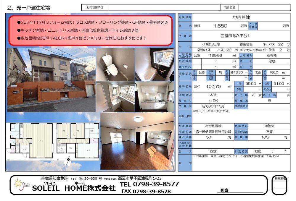 土地50坪以上 / 内装リフォーム / システムキッチン / 陽当り良好 / 閑静な住宅地 / LDK15畳以上 / 前道6m以上 / 和室 / 庭 / シャワー付洗面化粧台 / 2階建 / フローリング張替 / 温水洗浄便座 / 浴室に窓 / 吹抜け / 通風良好 / シャッター車庫 / 都市ガス / 小学校 徒歩10分以内