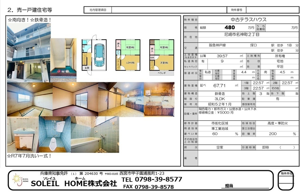 480万円 尼崎市名神町2丁目(テラスハウス)