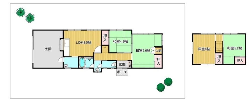 2沿線以上利用可 / 陽当り良好 / 全居室収納 / 閑静な住宅地 / 和室 / 庭 / 2階建 / 浴室に窓 / 緑豊かな住宅地 / 通風良好 / 都市ガス / 小学校 徒歩10分以内 / 平坦地 / 周辺交通量少なめ