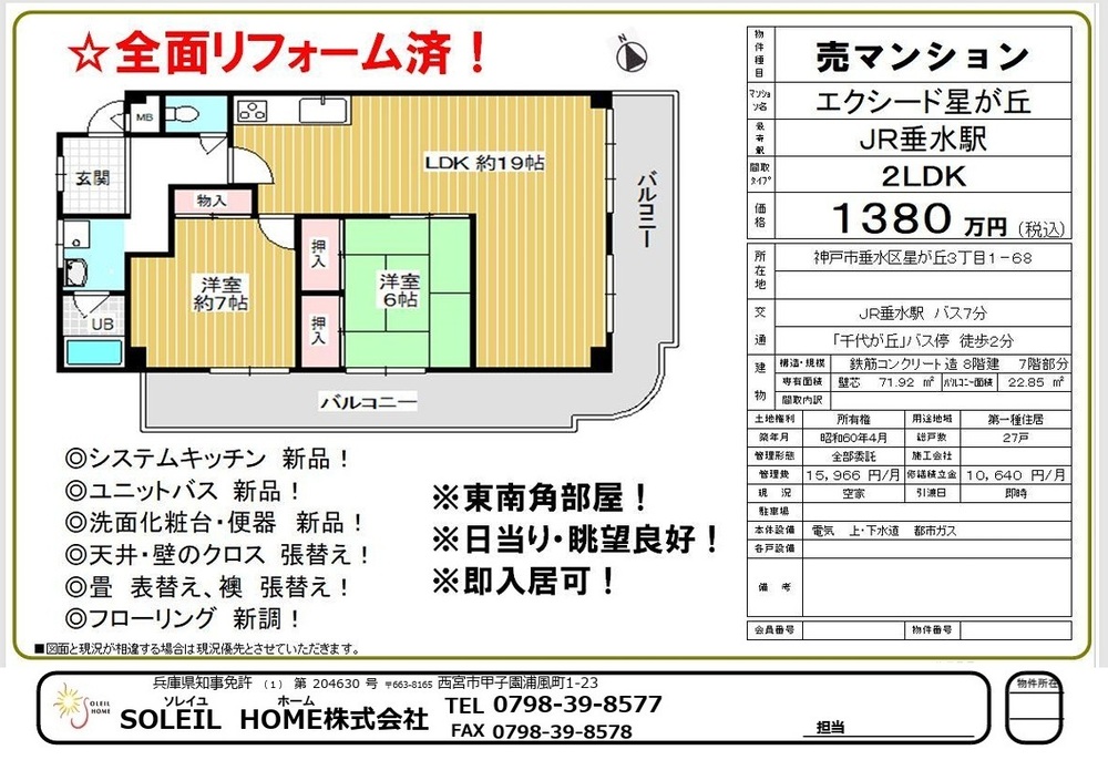 LDK18畳以上 / オーシャンビュー / スーパー 徒歩10分以内 / 内装リフォーム / システムキッチン / 角住戸 / 陽当り良好 / 全居室収納 / 閑静な住宅地 / 総合病院 徒歩10分以内 / 和室 / シャワー付洗面化粧台 / ワイドバルコニー / 東南向き / 南面バルコニー / フローリング張替 / 温水洗浄便座 / リノベーション / 通風良好 / 眺望良好 / 小学校 徒歩10分以内 / エレベーター
