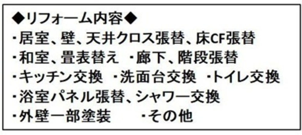 2沿線以上利用可 / スーパー 徒歩10分以内 / 内装リフォーム / 陽当り良好 / 駅まで平坦 / 閑静な住宅地 / 和室 / 外装リフォーム / 2階建 / 東南向き / 南面バルコニー / 温水洗浄便座 / 床下収納 / 浴室に窓 / TVモニタ付インターホン / 通風良好 / 都市ガス / シューズインクローク / 小学校 徒歩10分以内 / 平坦地 / 周辺交通量少なめ