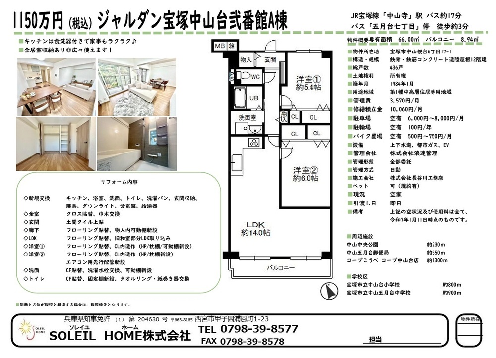 1150万円 ジャルダン宝塚中山台弐番館A棟