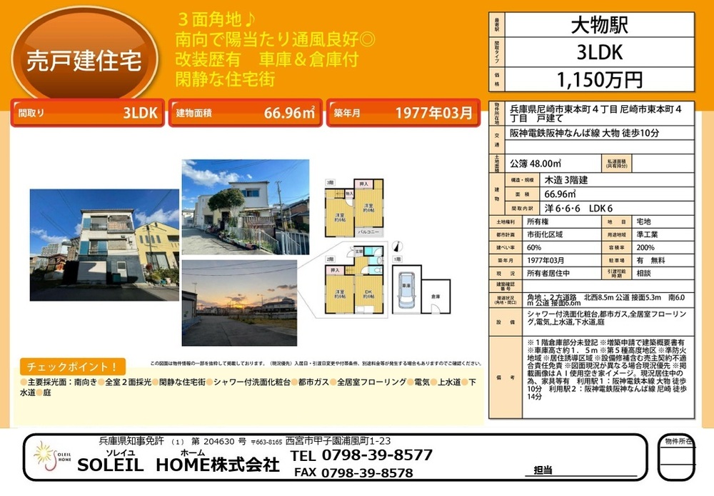 2沿線以上利用可 / スーパー 徒歩10分以内 / 内装リフォーム / 南向き / 陽当り良好 / 全居室収納 / 駅まで平坦 / 南側道路面す / 閑静な住宅地 / 前道6m以上 / 角地 / 庭 / シャワー付洗面化粧台 / 通風良好 / 全居室フローリング / 全居室6畳以上 / 3階建以上 / 都市ガス / 全室2面採光 / 小学校 徒歩10分以内 / 平坦地