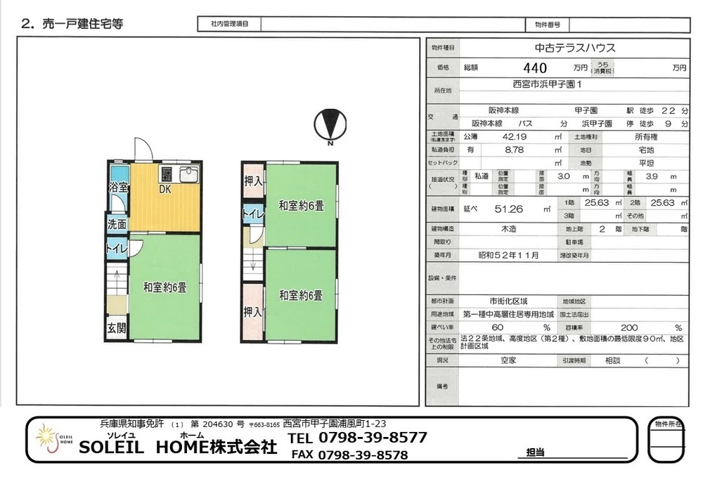 440万円 西宮市浜甲子園1丁目 テラスハウス