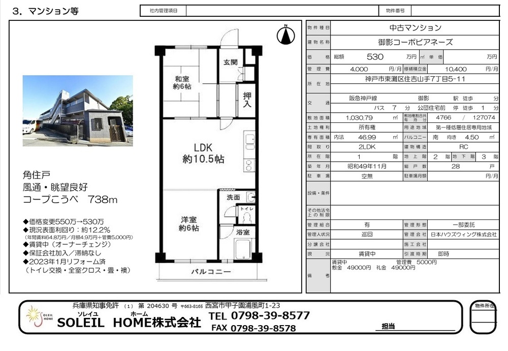530万円 御影コーポビアネーズ